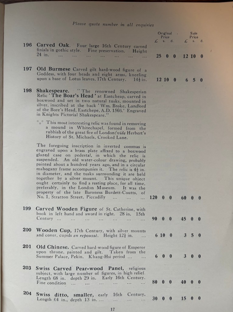 Sadly the catalogue does not have any photographs of the items for sale except the front cover image of what is described as ‘Carved English Royal Coat of Arms, Period Edward the 6th; fine preservation. A great rarity’ (priced at £37.10.0s, reduced from £75). The catalogue has more than 750 antiques for sale at 50% discount, including some important historical ‘relics’. Item 198 for example (see below) ‘The renowned Shakespearian Relic ‘The Boar’s Head’ at Eastcheap, carved in boxwood and set in two natural tusks’ and priced at £60 (reduced from £120). This was a famous object in the 19th century, having been in several collections, including that of the antiquary Thomas Windus FSA (1778-1854).