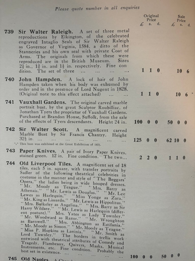 Coincidently a while ago I acquired an old sales catalogue produced by J. Rochelle Thomas in 1923 which also contains several items for sale with significant historical associations. The catalogue was issued to facilitate a ‘Clearance Sale’ that Rochelle Thomas undertook in 1923 as part of a refurbishment of his shop in King Street, St. James’s. As the catalogue states, ‘To my customers, as I am about to make extensive alterations to my premises I find it necessary to hold a Clearance Sale of the greater portion of my stock, and I am doing so at 50 per cent. in every case below the original marked prices in order to realise promptly.’ Here’s the cover of the catalogue: