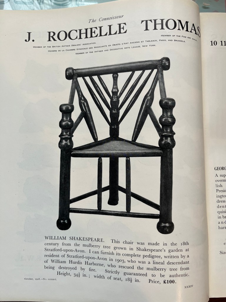J. Rochelle Thomas appears to have been fascinated by objects that had interesting historical associations – in this sense he was certainly an antiquarian – and often advertised such objects in his sales advertising campaigns in magazines such as Apollo and The Connoisseur. One example (of many!) is an advert for a chair made from the famous (infamous!) mulberry tree wood from Shakespeare’s house in Stratford-on-Avon – if you’re interested in Shakespearian mulberry tree ‘relics’ do have a look at my essay on the subject (see – Mark Westgarth, ‘Well Authenticated Blocks’ in Shakespeare’s Afterlife in the Royal Collections edited by Sally Barnden, Gordon McMullan, Kate Retford and Kirsten Tambling, (Oxford University Press, 2025), pp.103-111)