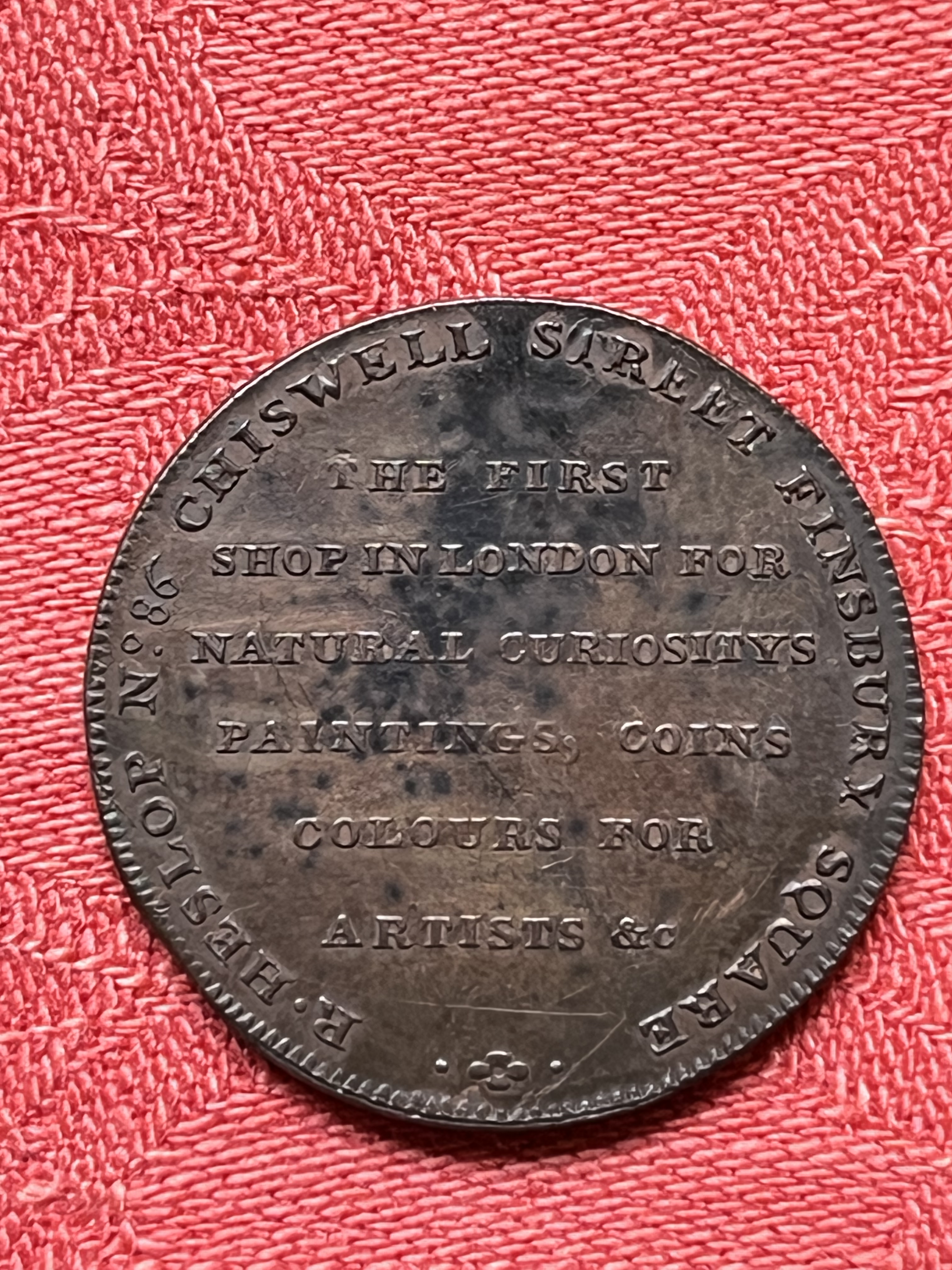 The verso of Heslop’s token gives his address at 86 Chiswell Street, London and, like that of William Till, highlights Heslop’s trade – this time as a dealer in ‘Natural Curiosities, Paintings, Coins..’ and supplying ‘colours for artists’. It was very common for ‘curiosity dealers’ in the period to be involved overlapping markets and practices.