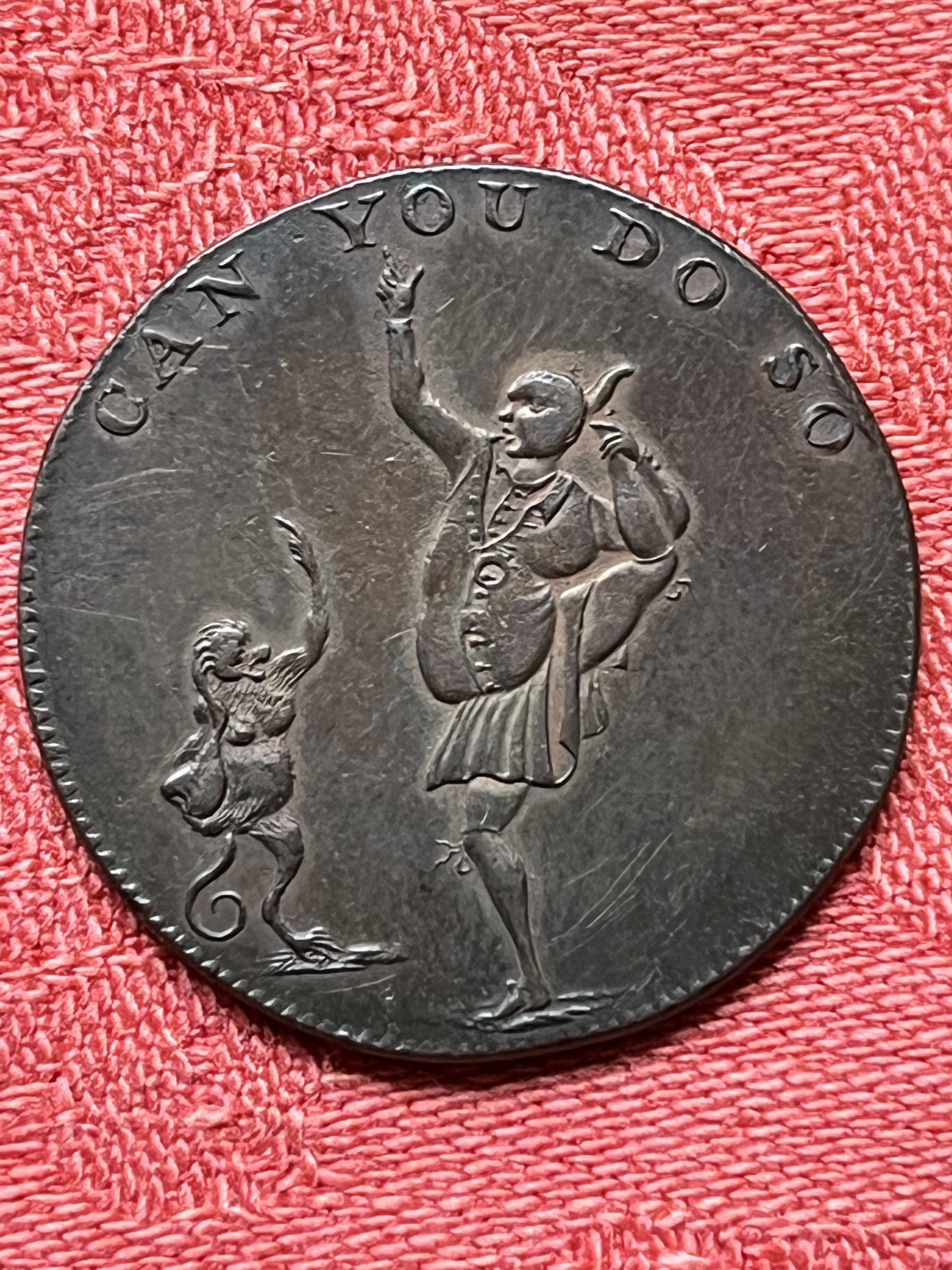 Curiously, a few years ago we also found another copper trade token produced by a ‘curiosity dealer’. This one produced by the dealer Robert Heslop, who traded from 62 Whitecross Street, London during the 1820s and 1830s. Heslop’s token, (also 26mm diameter), is said to very rare and to date from c.1795; it shows the famous 17th century contortionist Joseph Clarke, said to be the most extraordinary ‘posture master’, beneath the words ‘CAN YOU DO SO’.