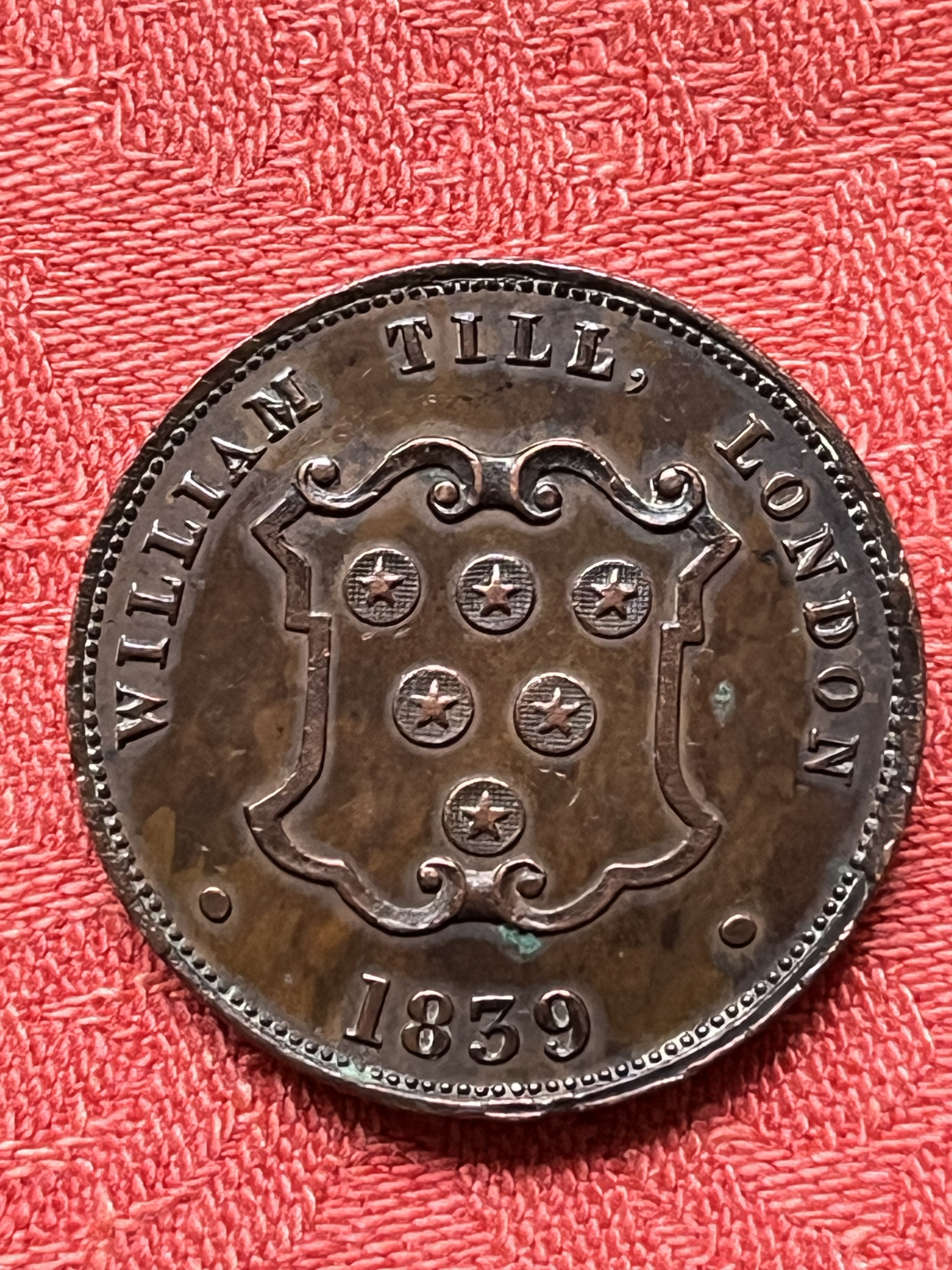 Till produced several versions of his token during the 1830s – in the above example he has included an emblem which seems to mirror the Arms of the Medici family, the enormously wealthy family based in Florence in the 15th and 16th centuries, founders of the Medici bank; the 6 balls in the cartouche in Till’s medal mimic the 6 balls in the Medici crest – Till seems to use it as a visual pun.