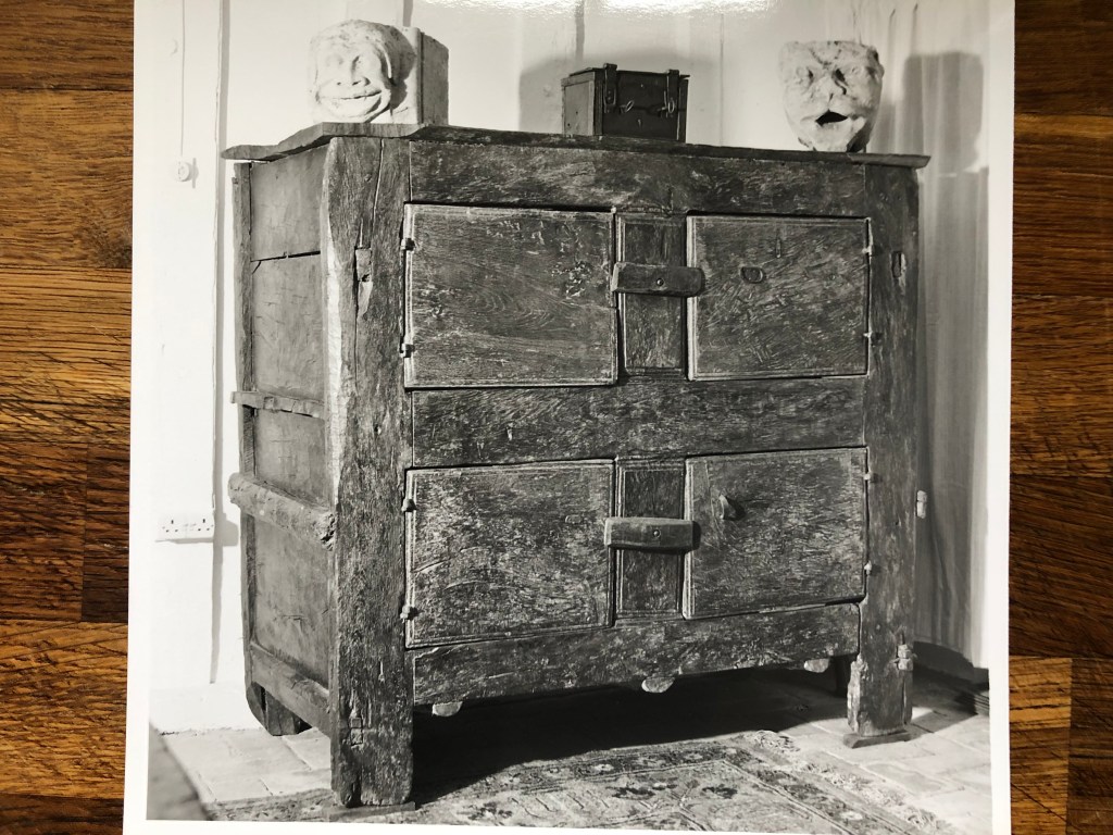 Morse sold many spectacularly rare pieces of early oak furniture and early sculpture and objects – this early oak hutch for example; the stone head corbel on the top, left, was, so Charlotte tells us, discovered in the lake in the grounds of Colne Priory, and must have come from the Benedictine Priory itself.