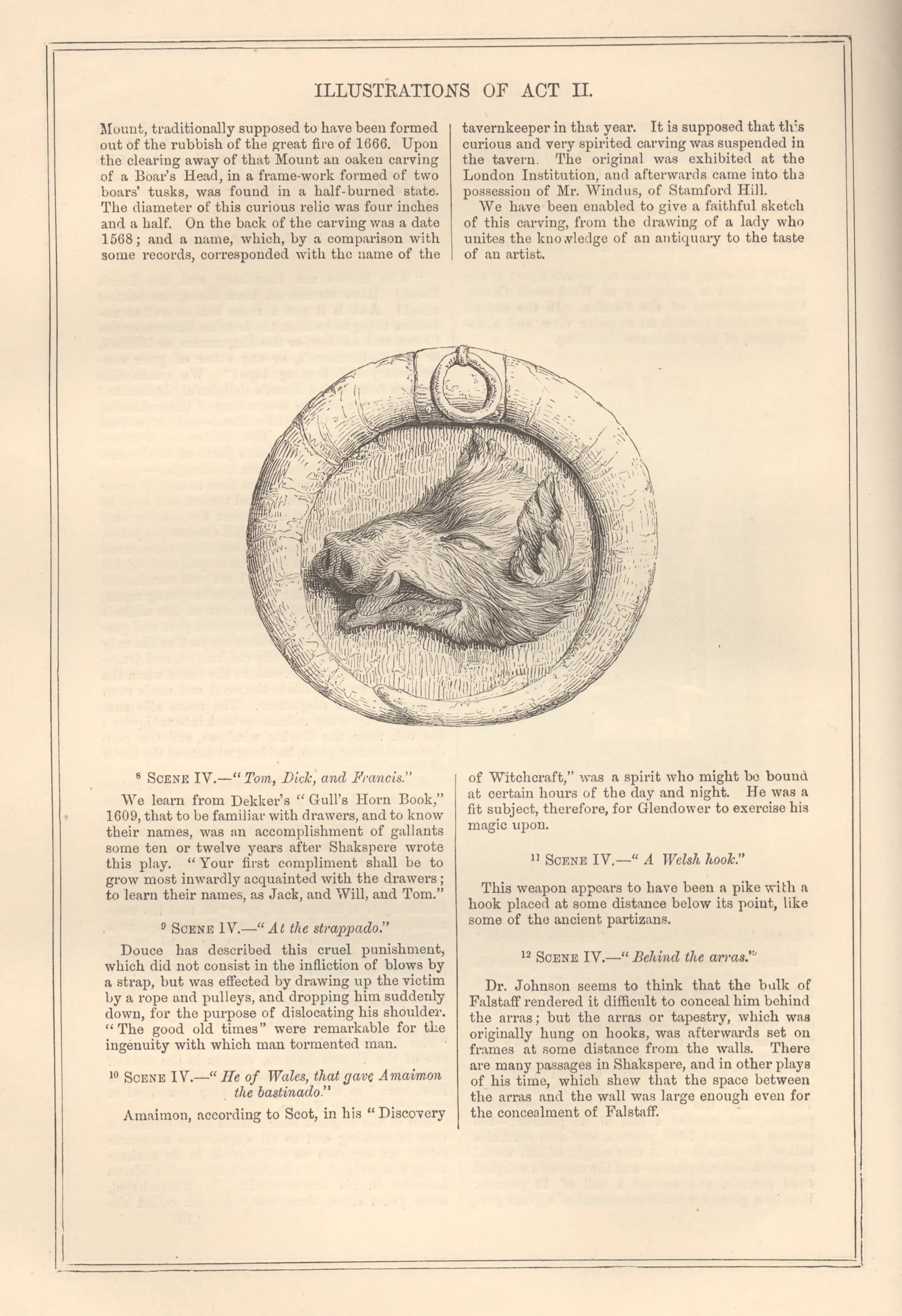 The ‘Boar’s Head’ was offered for sale at the auction of the collection of Thomas Windus in 1855 where it was reportedly sold for £25 and 4 shillings to the Shakespeare scholar James Halliwell-Phillipps (1820-1889), editor of a lavish Shakespeare Folio edition at the time. It was illustrated in The Pictorial Edition of the Works of Shakespeare edited by Charles Knight (volume 1, 1839-42) – (see below).