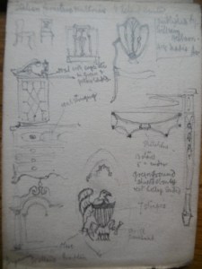 Page of drawings of details of antique furniture. PoH notebook, c.1920; uncatalogued. Brotherton Library Special Collections, University of Leeds.