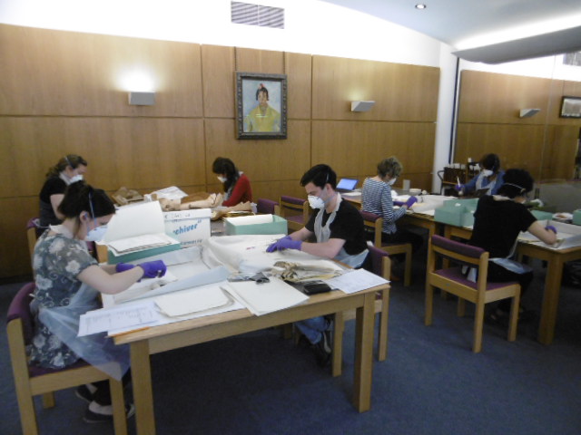 We are making steady progress this week on the enormous task of cleaning and cataloguing the Phillips of Hitchin archives at the Brotherton Library Special Collections at the University of Leeds. The Brotherton Library drafted in their Special Collections team, and extra volunteers, for the rest of the ‘Action Week’ project on the archive – special thanks to the hard work of Francis (conservator at the Brotherton Library), together with Sharon, (head conservator) and our team of volunteers, Sue, Pauline, Heather, Matt, Helen and Riza – we are getting through the masses of material now. Here’s the team in the Special Collections archive room at the Library, busy cleaning, all masked-up – it’s dangerous work!