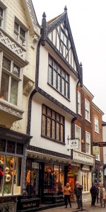 The early 19th century engraving of the ‘Tudor House’ is from The Antiquities of York (1813) by the antiquary H. Cave. The decorative pargetting (moulded plasterwork) on the front of the building was removed in the late 19th century, and the windows and the shop front itself have obviously been remodelled, but the building structure remains mostly the same as it was when it was constructed in the 17th century – according to Historic England the building is believed to date from early 17th century, despite a spurious date of ‘1489’ carved on the second-floor bressumer (the beam that traverses the front of the building) – the spurious date was obviously one of the reasons for the house being called ‘The Tudor House’ at some stage in its life.