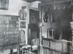 The pamphlet includes some fascinating photographs of the interiors of ‘The Tudor House’. The displays were arranged as a series of ‘Period Rooms’, which was becoming a discrete marketing and display technique amongst antique furniture dealers during the 1910s and 1920s, and such historical recreations were also becoming more popular in the displays in public museums at the same time. The ‘Tudor House’, for example, had an ‘Elizabethan Panelled Living Room’ (shown below), furnished with antiques from the period.