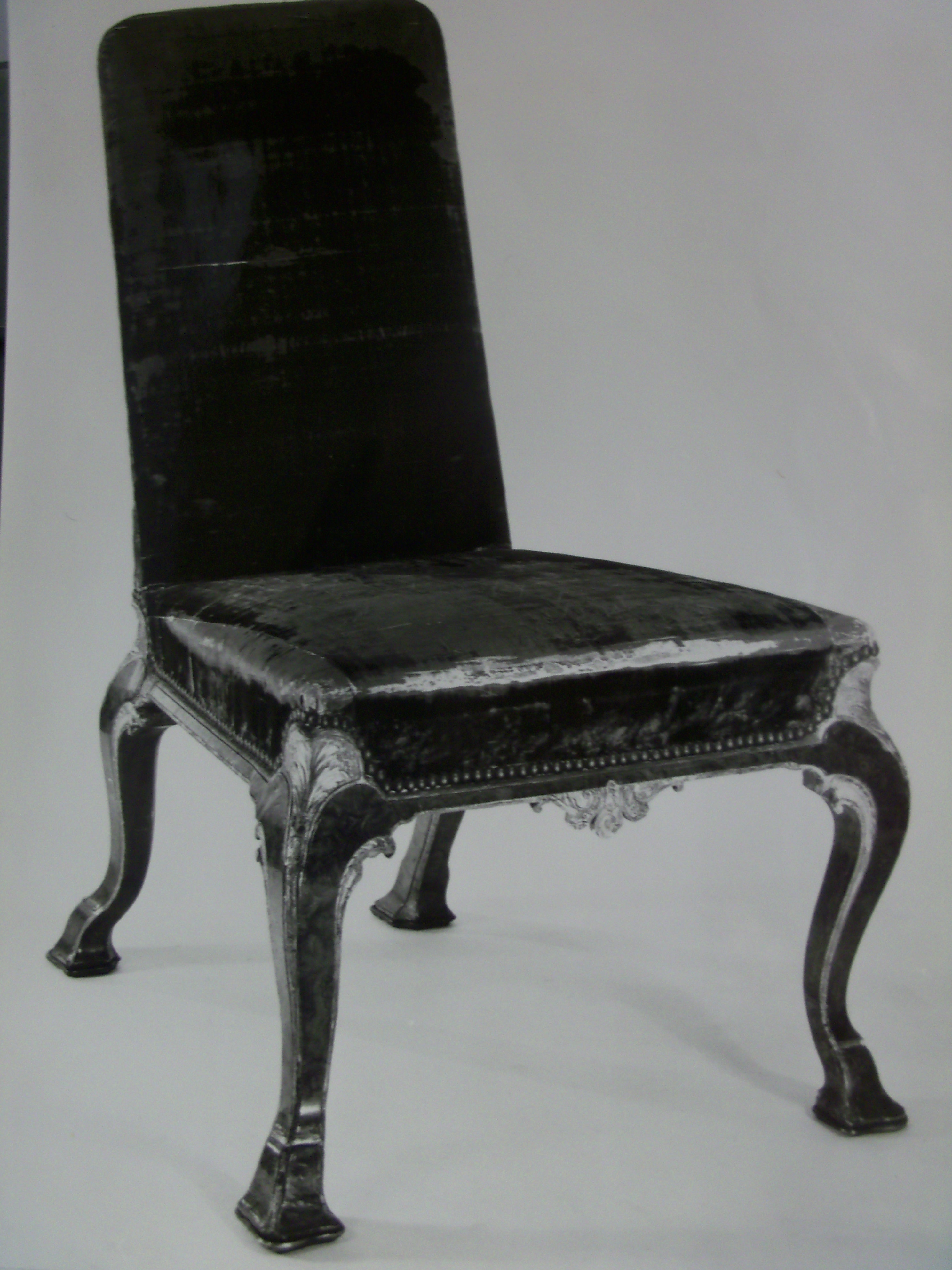 7th object – (see below) the narrator describes 3 walnut chairs, ‘made about 1690’. There are a number of such chairs in the exhibition catalogue, but without a photograph of them from the catalogue it has not been possible to identify which of the chairs the narrator is referring too? However, the centre chair, could be No.50 in the catalogue, ‘A William and Mary armchair of small size, circa 1690’, and said to have ‘traditionally been used by Queen Anne’; it was offered for sale by the well-known dealers Moss Harris & Sons.