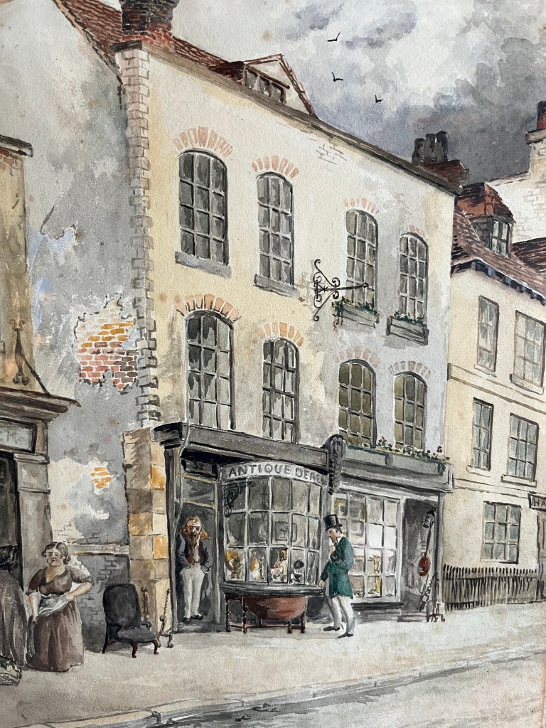Levine tends to write out dealer names in full next to the Lot numbers and there are some familiar dealers listed as buyers – Rixon, Lee, Mannheim, Cohen etc. The buyer of Lot 575 is noted as ‘JW’, listed by Levine as the buyer of many Lots at the Thornham Hall auction. ‘JW’ is obviously someone familiar to Levine and is almost certainly the dealer John Wordingham. Wordingham established his antique dealing business in 1908 and was a member of the BADA. He had been a neighbour of Levine at 74 Prince of Wales Road in the 1920s, but by the 1930s (at the time of the auction) he was trading from the famous 16th century ‘Augustine Stewards House’, Tombland, Norwich. Below is a photograph of Wordingham’s shop in 1935 just a couple of years before the Thornham Hall auction.