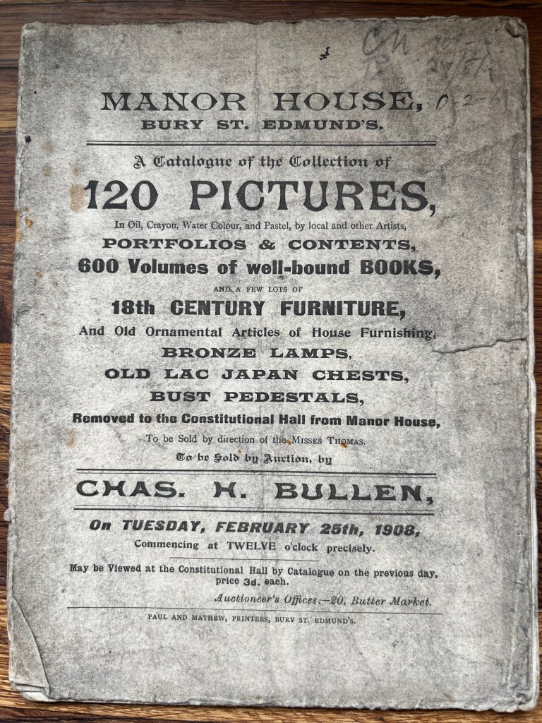 As well as the catalogues from the 1930s and 1940s, six of the catalogues date from 1908 and have various annotations signed by ‘R. Levine’ so maybe by Rueben Levine (1865-1927) himself? The catalogue of the contents of ‘Manor House, Bury St. Edmunds’ (sold by Charles Bullen in February 1908) is particularly interesting.