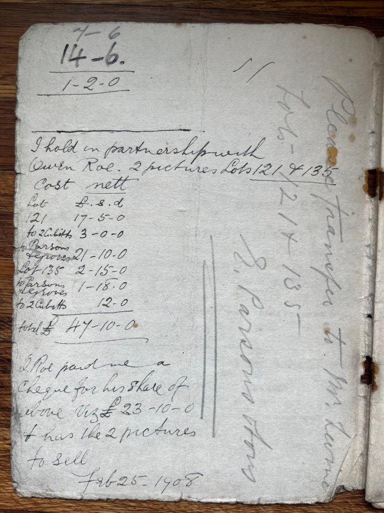 What these handwritten notes seem to point towards is an auction ‘ring’. ‘Please transfer to Mr Levine’ indicates that ‘E. Parsons’ was the buyer of the paintings at the auction but for some reason transferred his purchases to Levine. This is classic ‘ring’ activity – indeed one of the key aspects of attempts to stop the ‘ring’ is that auctioneers now specifically disallow transfers between buyers.