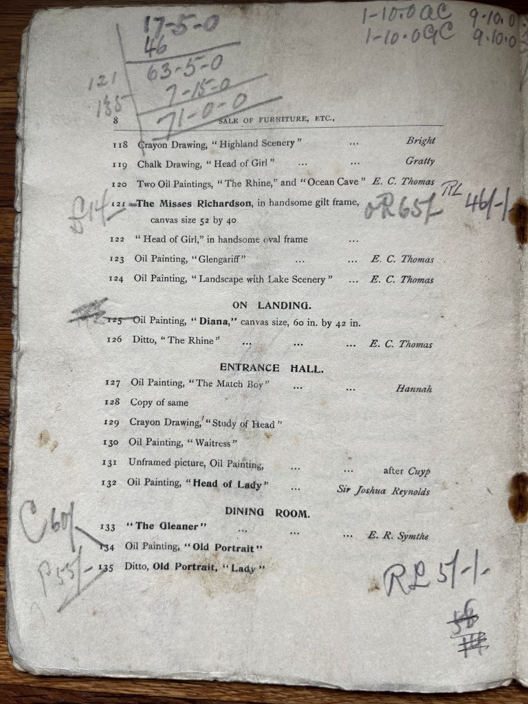 The Manor House catalogue has two intriguing hand written notes on the verso of the front cover (see below). The notes relate to 2 paintings sold at the auction. The note written in pen (to the left in the photograph) states ‘I hold in partnership with Owen Roe. 2 pictures Lots 121 & 135’, which cost a ‘total of £47-10-0’. It also has a note at the bottom stating ‘O. Roe paid me a Cheque for his share of above Viz £23-10-0 & has the 2 pictures to Sell. Feb 25-1908’. Owen Roe was an antique dealer trading from various shops in Cambridge, the business began in the late 19th century and continued in the family until the mid 1970s.