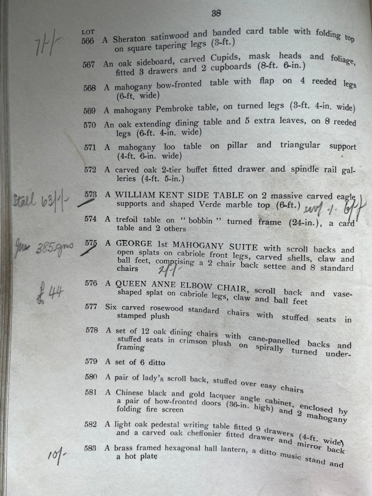 The Thornham Hall catalogue also contains annotations made by Levine, indicating maximum bids and some prices realised (in pounds, shillings and pence) with the names of other antique dealers who had bought important lots. Below (see picture), Lot 573, ‘A WILLIAM KENT SIDE TABLE’ was bought for £63 by the London dealer Isaac Staal & Sons (Levine writes it as ‘Stall’) important dealers in antique furniture with a smart shop in Brompton Road, London at the time. Lot 575, ‘A GEORGE 1ST MAHOGANY SUITE’ made the enormous sum of 385 guineas (£404 and 5 shillings – equivalent to about £148,000 at the time). Unfortunately there are no illustrations of the Lots in the catalogue.